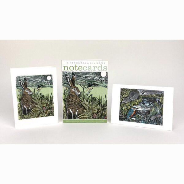 This pack of ten notecards has five cards of each of the two designs. The two designs are ‘Hidden Hares’ & ‘Kingfisher and Squirrel’ by Angela Harding. The notecards are from Art Angels Publishing, Norwich.